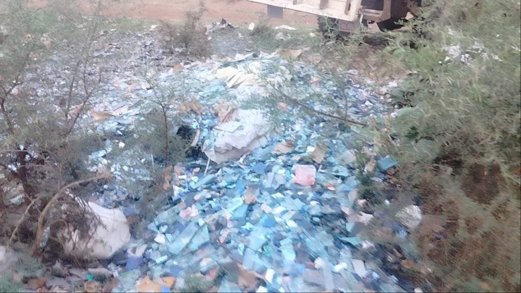 कवर्धा – ठोस अपशिष्ट प्रबंधन के नियम के विपरीत खतरनाक कांच के टुकड़े गाड़ियों में भर कर कवर्धा राजनांदगांव बाईपास रिंगरोड में नहर किनारे व प्रशासन द्वारा किये गए वृक्षा रोपन स्थल में फेंक कर लोगो के जीवन संकट में डाल रहे कांच के व्यापारी ।