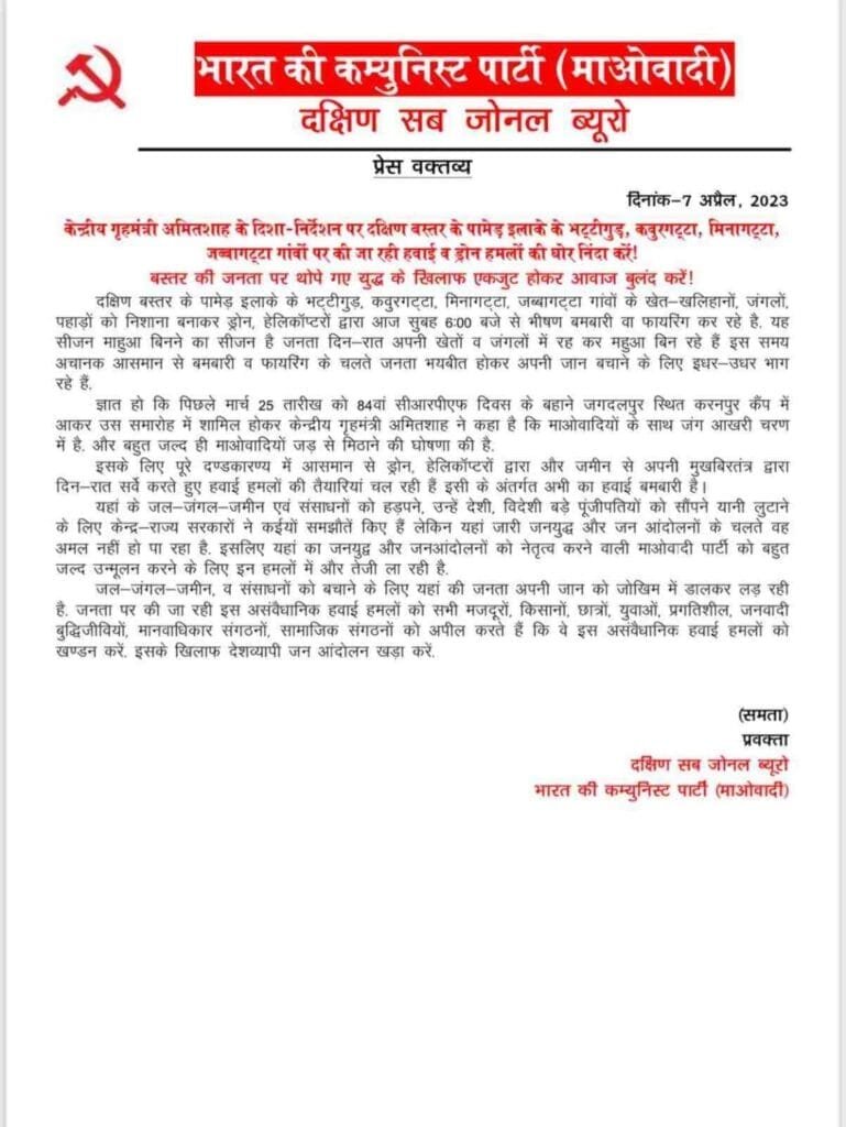 नक्सलियों ने जारी किया प्रेस नोट, कहा – पामेड़ इलाके में सुबह से ड्रोन और हेलीकॉप्टर से हो रही बमबारी