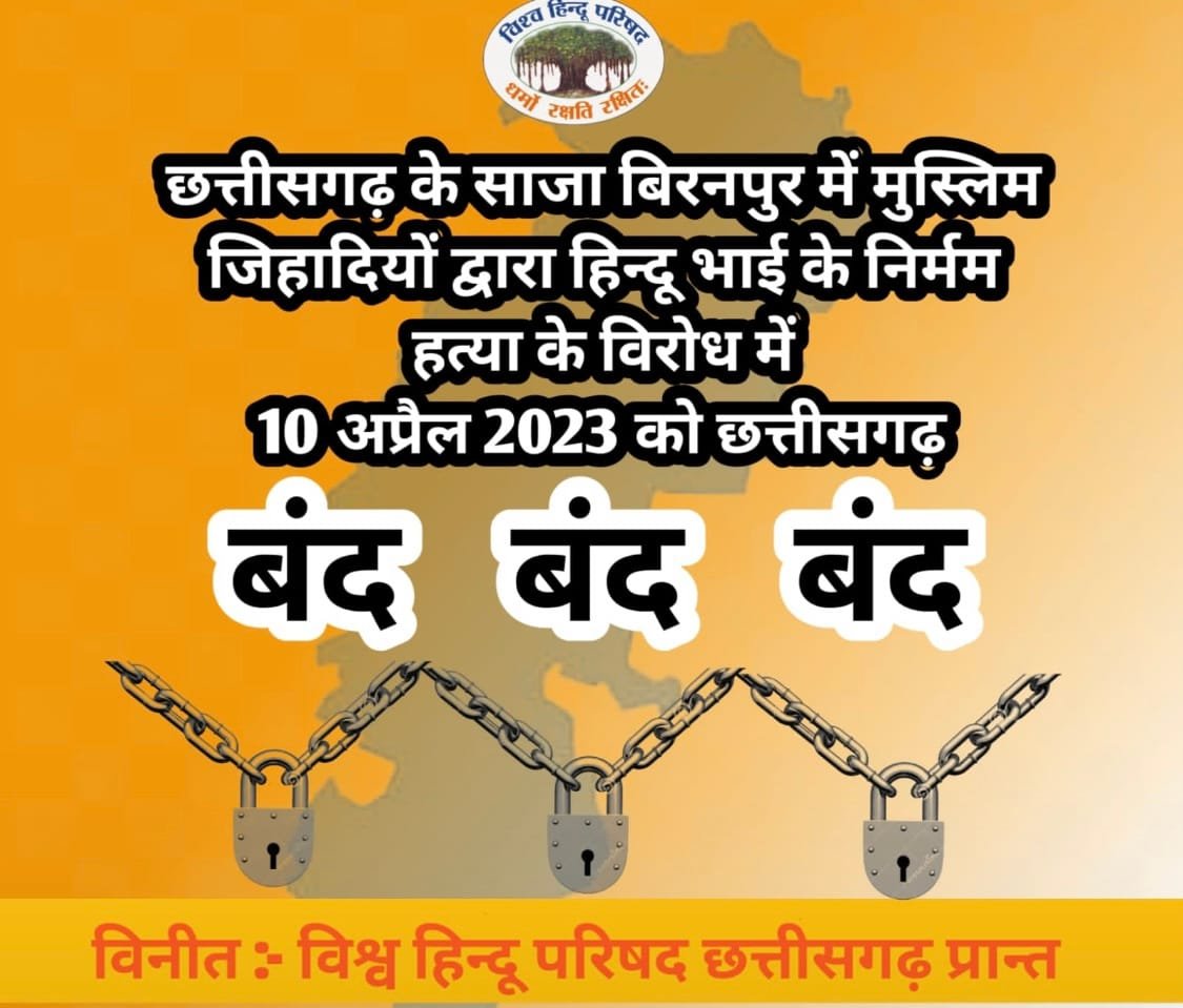 साजा की घटना पर विश्व हिन्दू परिषद की ओर से प्रेस वार्ता ली गई. परिषद के कार्यकारी अध्यक्ष संत चंद्रशेखर वर्मा ने कहा कि साजा की घटना के विरोध में किए जा रहे सोमवार को छत्तीसगढ़ बंद के लिए व्यापारियों और संगठनों से समर्थन मांगा है. सुबह 5 बजे से सभी लोग निकलेंगे. बंद को सफल बनाने के लिए सभी लोगों का आह्ववान किया गया है. इसके बाद सुबह 11 बजे से दोपहर 2 बजे तक चक्काजाम किया जाएगा.