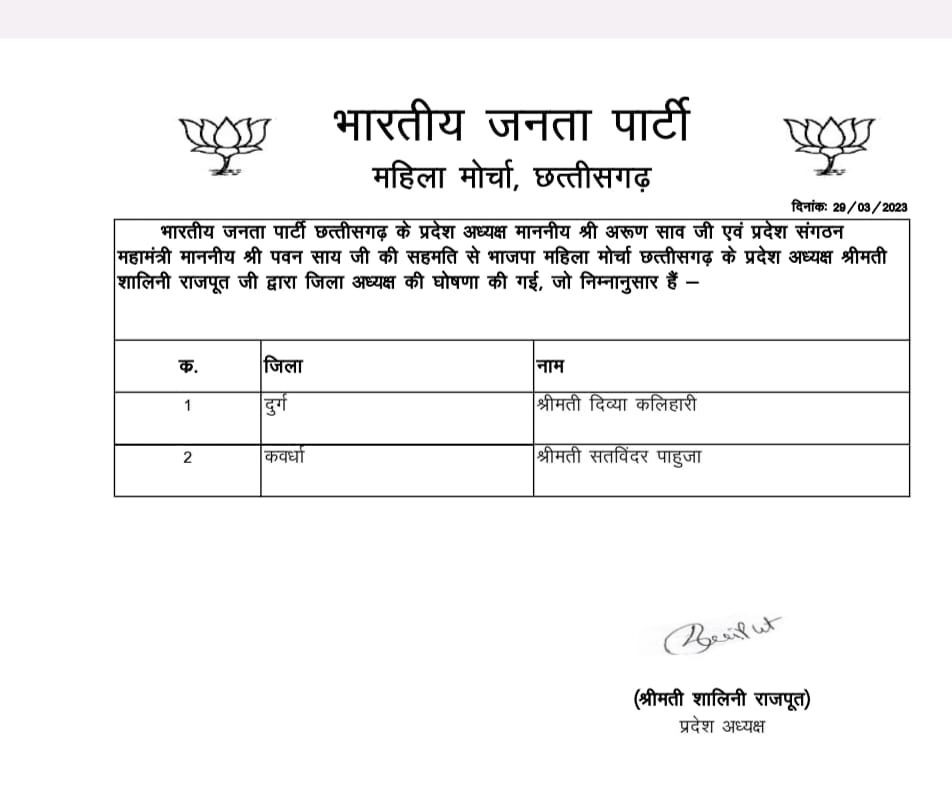 भारतीय जनता पार्टी छत्तीसगढ़ के प्रदेश अध्यक्ष अरूण साव एवं प्रदेश संगठन महामंत्री पवन साय की सहमति से भाजपा महिला मोर्चा छत्तीसगढ़ के प्रदेश अध्यक्ष शालिनी राजपूत द्वारा जिला अध्यक्ष की घोषणा की गई है।