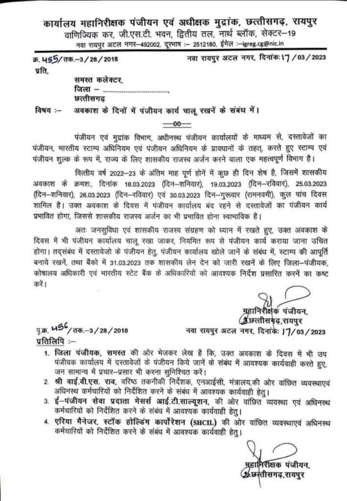 CG NEWS : अब सरकारी छुट्टी के दिन भी होगी रजिस्ट्री, खुलेंगे पंजीयन कार्यालय, आदेश जारी…