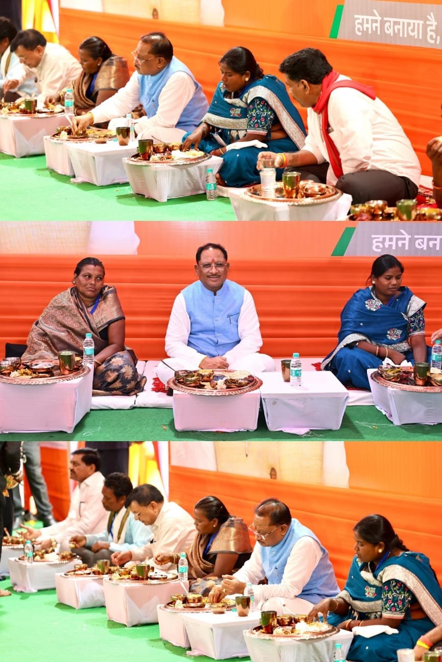 मुख्यमंत्री श्री विष्णु देव साय ने ‘आज मोर आवास-मोर अधिकार‘ कार्यक्रम के पश्चात प्रधानमंत्री आवास योजना के हितग्राहियों के साथ बैठकर भोजन किया। इस दौरान मुख्यमंत्री श्री साय ने साथ में बैठकर भोजन कर रही जशपुर जिले के कुनकुरी निवासी श्रीमती फुलजेन्सिया एक्का और फरसाबहार की श्रीमती कुसुम से चर्चा करते हुए उनका एवं उनके परिवार का कुशलक्षेम जाना। मुख्यमंत्री के साथ भोजन करने वालों में जशपुर के श्री राम, कबीरधाम के श्री दौलतराम व श्री लालाराम, बस्तर के श्री लाहेन्द्र सिंह और श्रीमती सोनामणि, मुंगेली के श्री महेश और श्री समारू साहू, कांकेर की श्रीमती पूर्णिमा पटेल, बलौदाबाजार की श्रीमती हेमिन ध्रुव, रायपुर की श्रीमती रामबती पुरैना और श्री जट्टासिंग शामिल थे।
